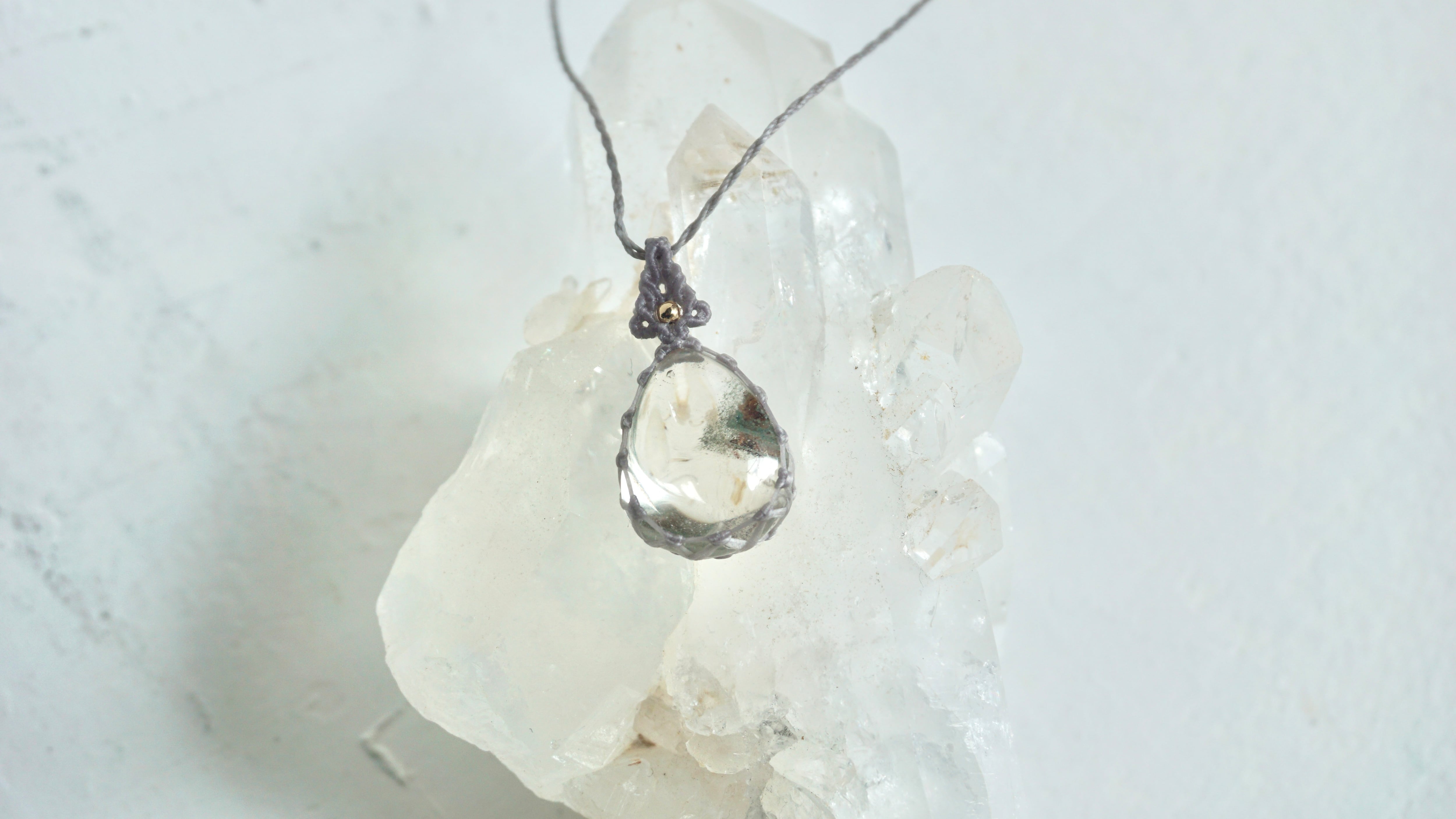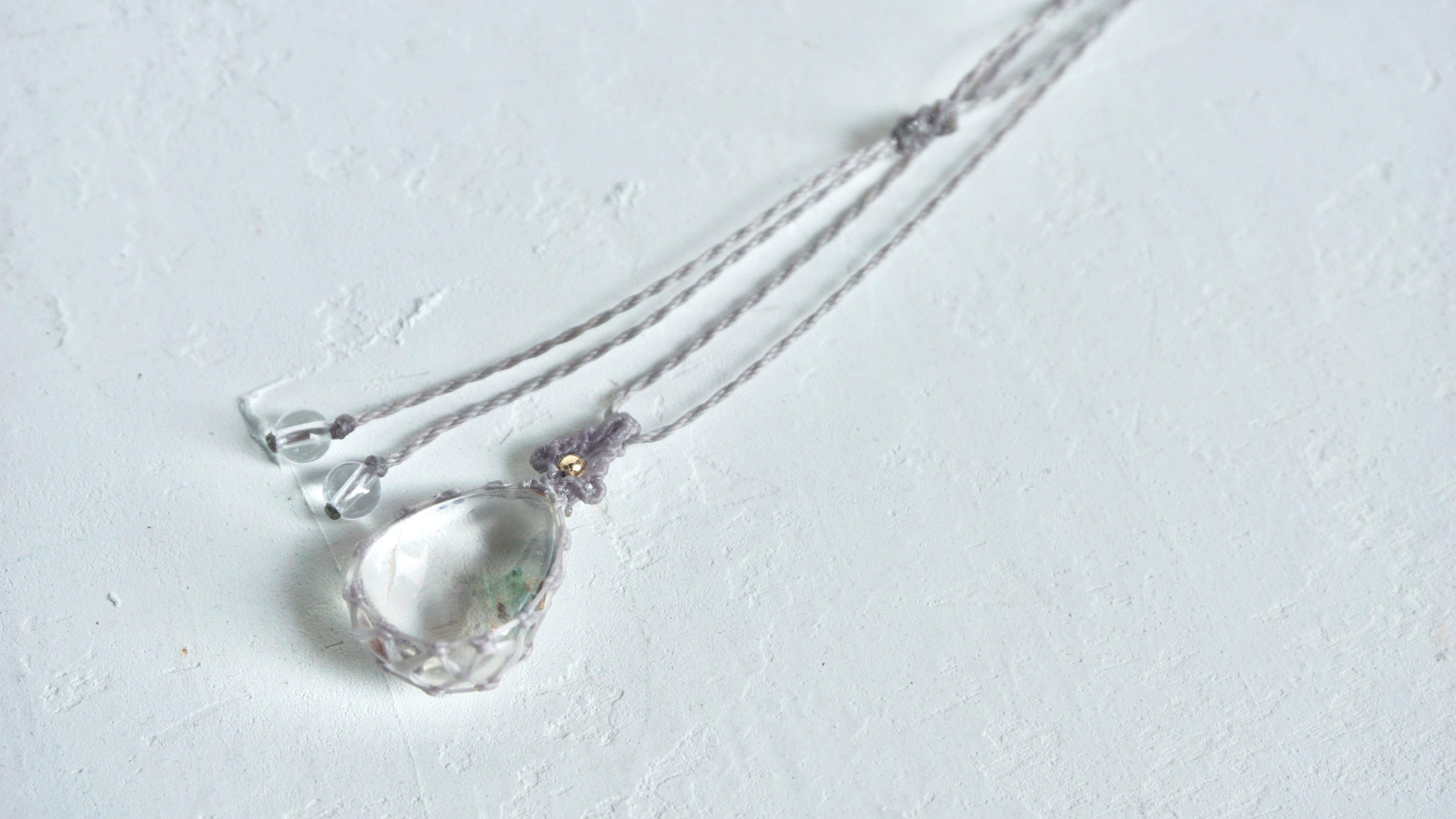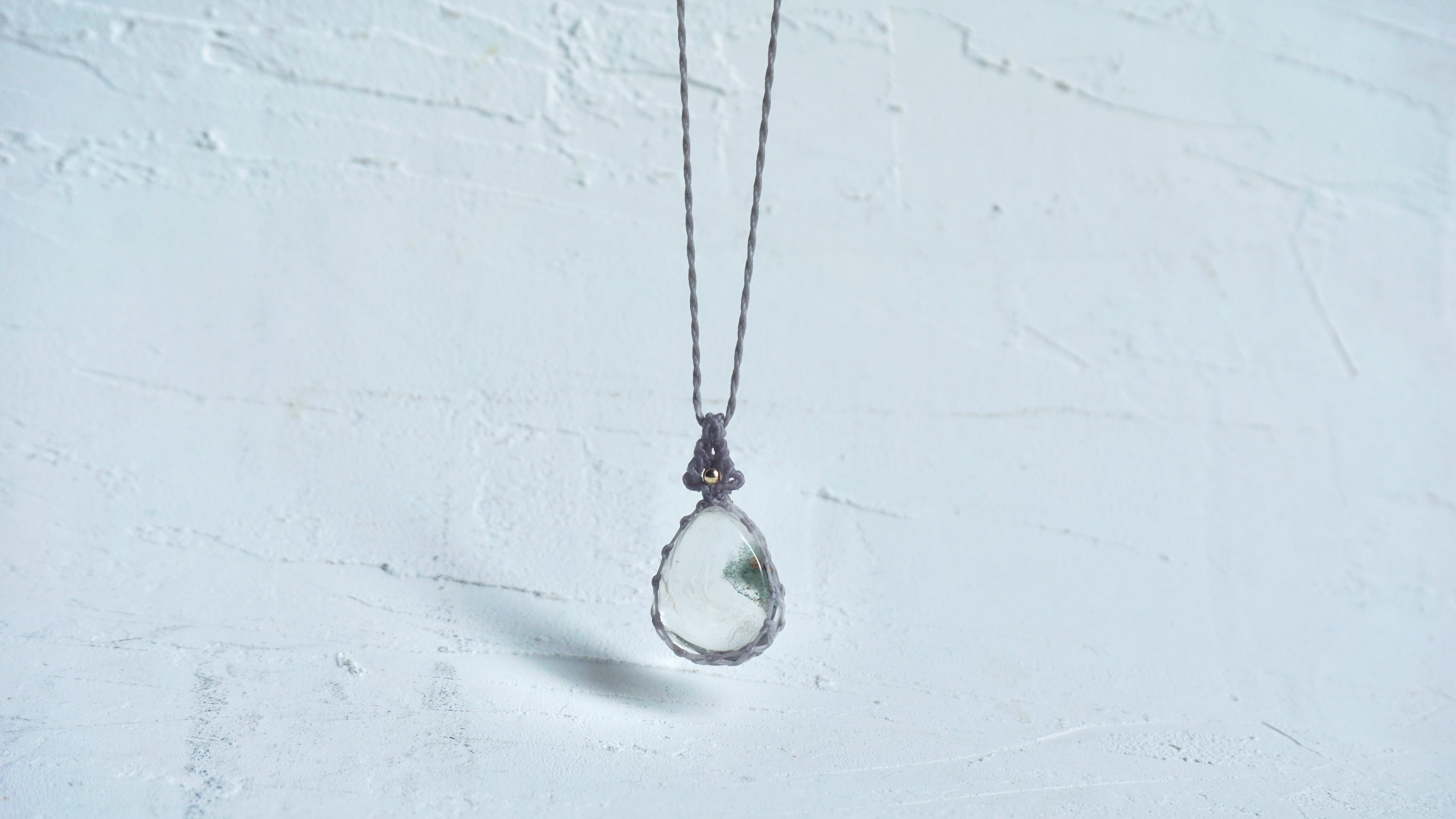 透明な水晶の中にふわっとファントムが映る石をネックレスに仕立てました。ナチュラルな雰囲気と水晶の輝きは身につける方の魅力を引き立てる仕上がりとなりました。
