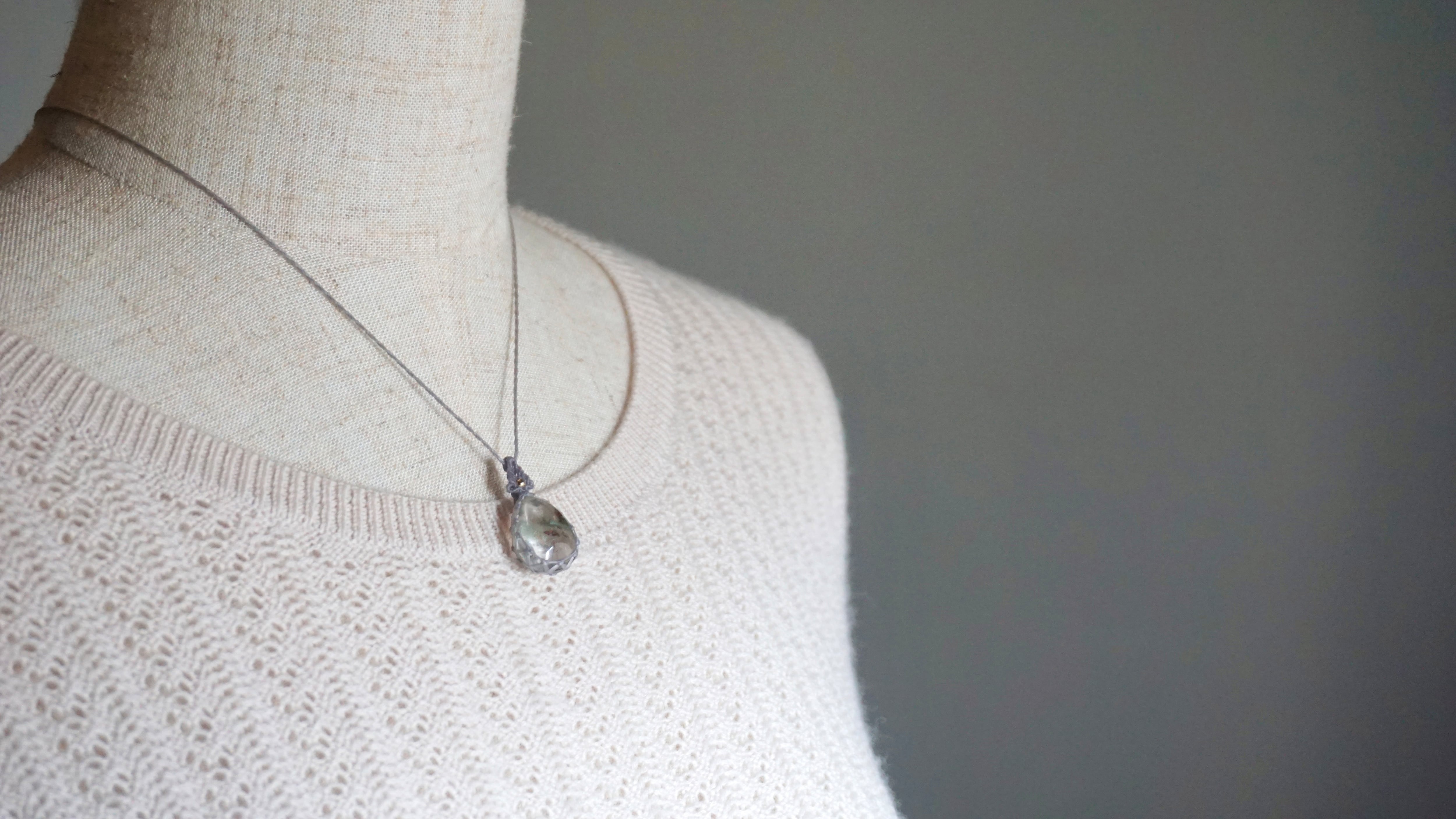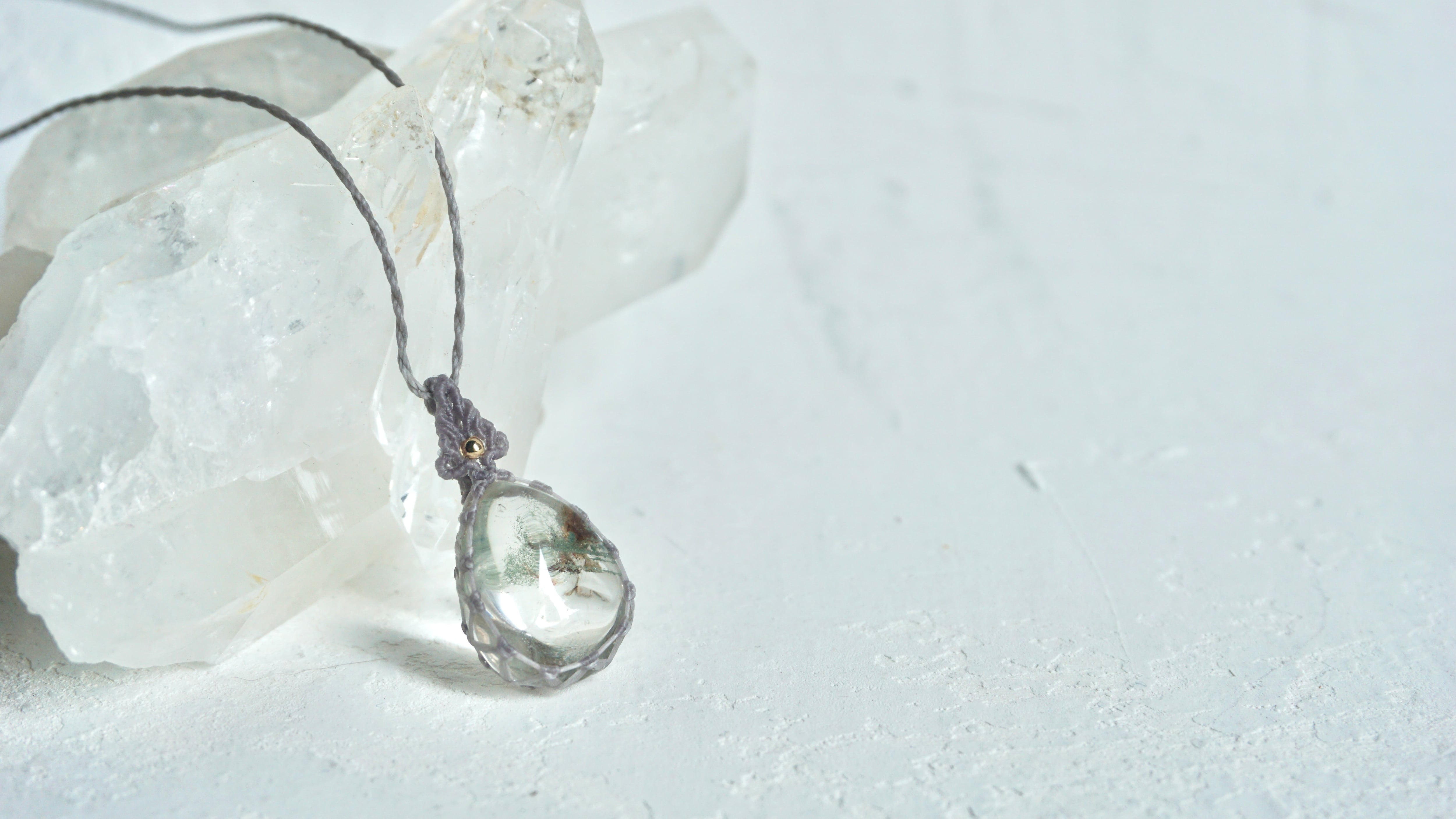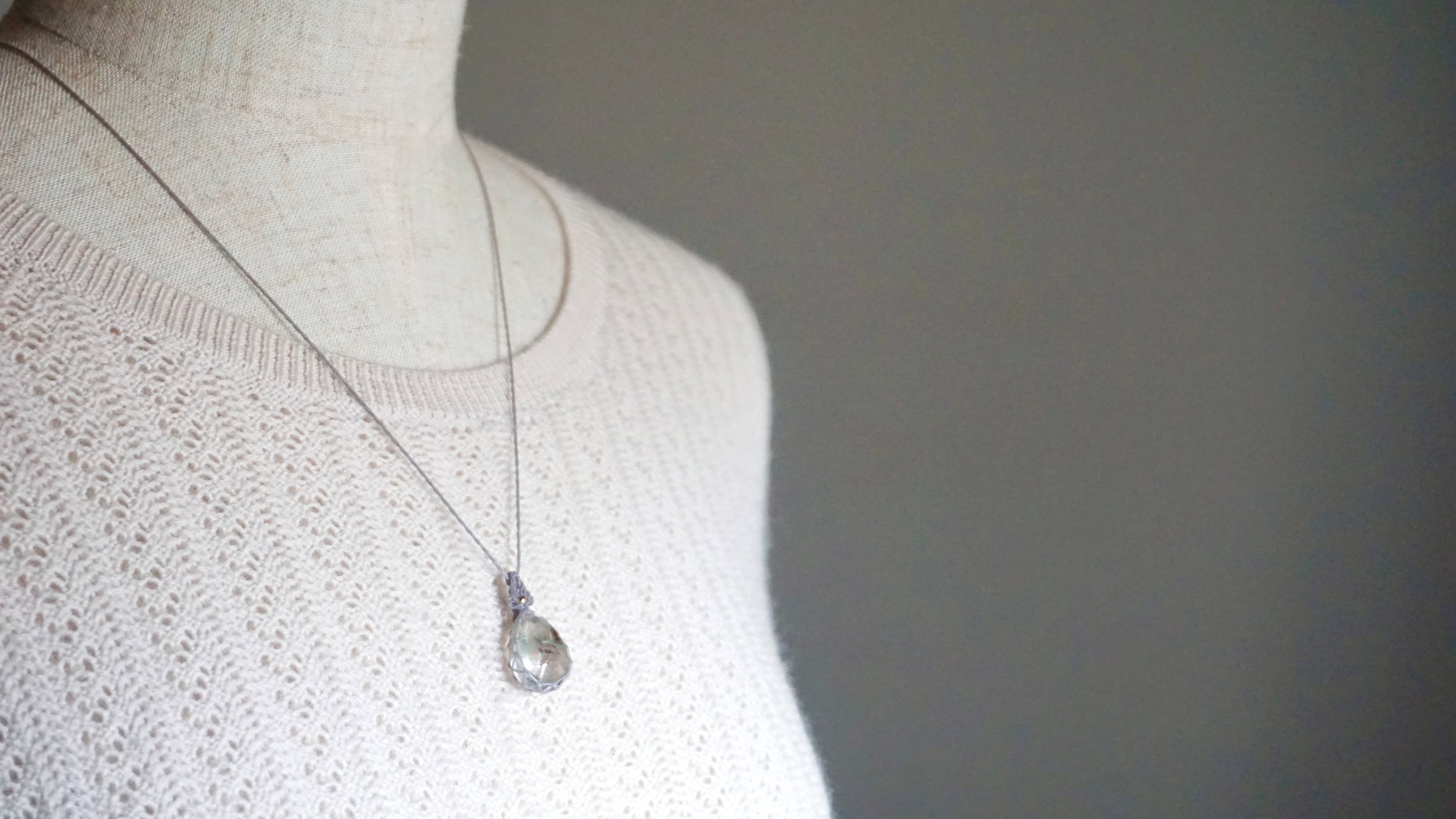 透明な水晶の中にふわっとファントムが映る石をネックレスに仕立てました。ナチュラルな雰囲気と水晶の輝きは身につける方の魅力を引き立てる仕上がりとなりました。