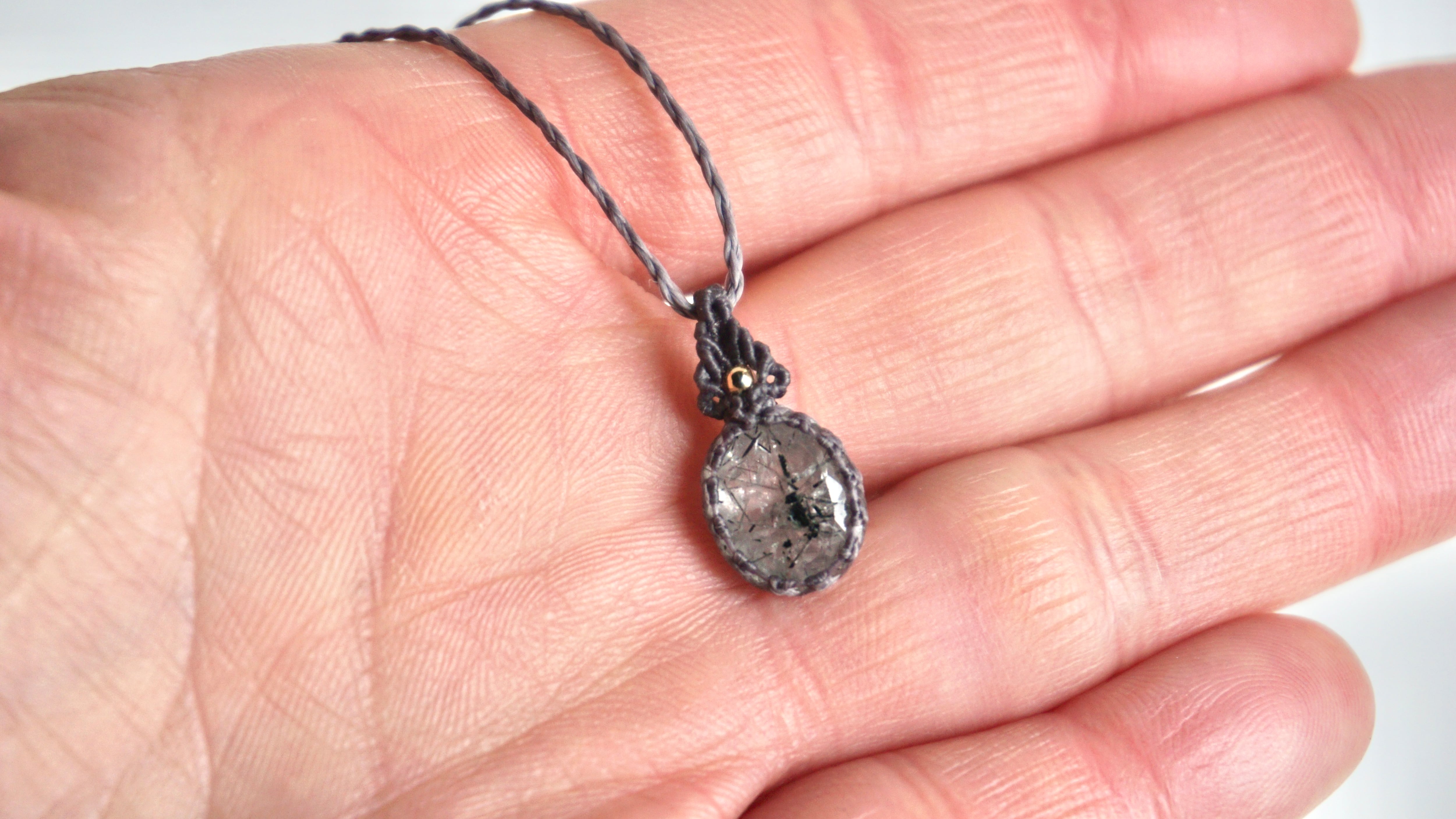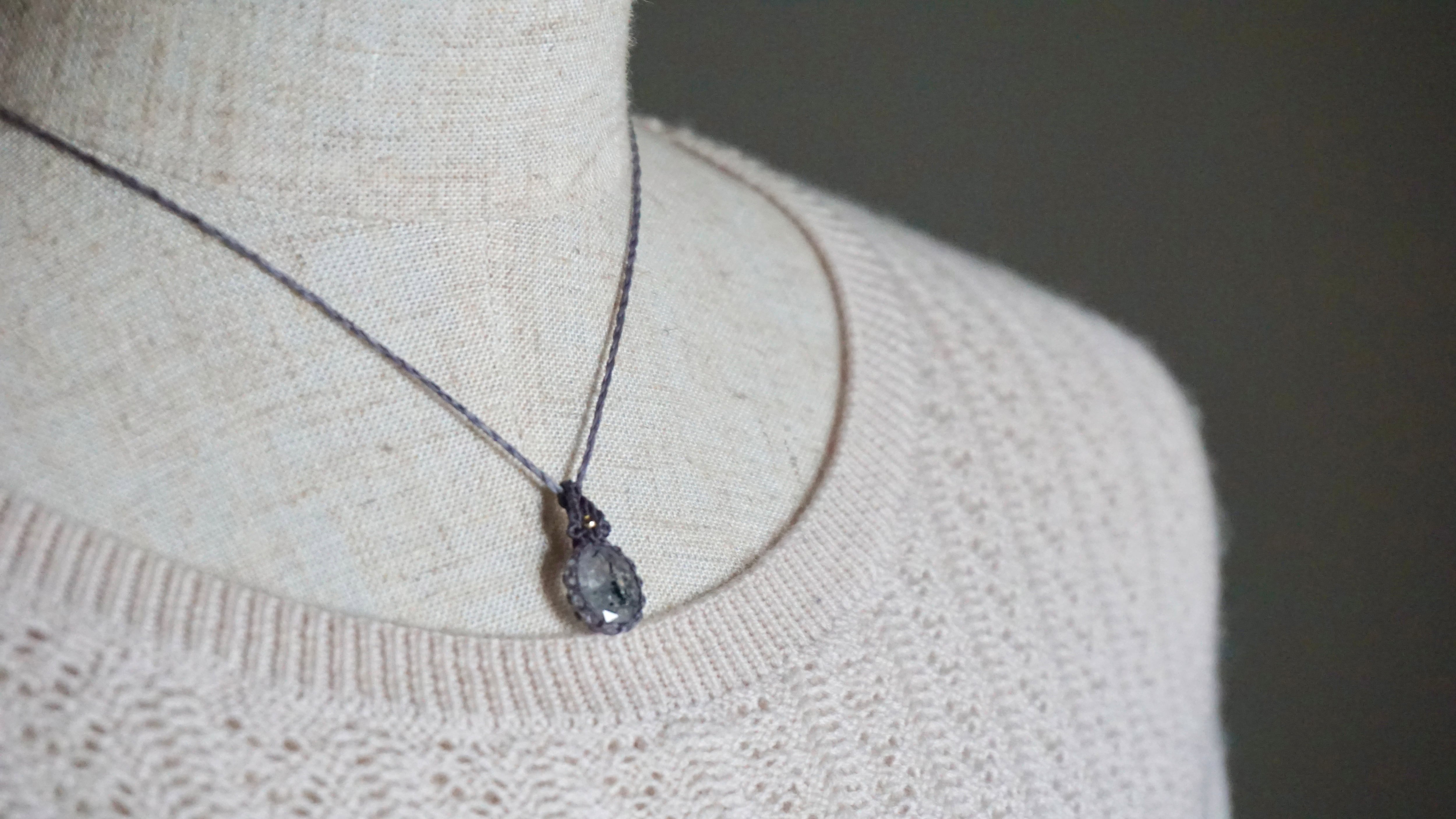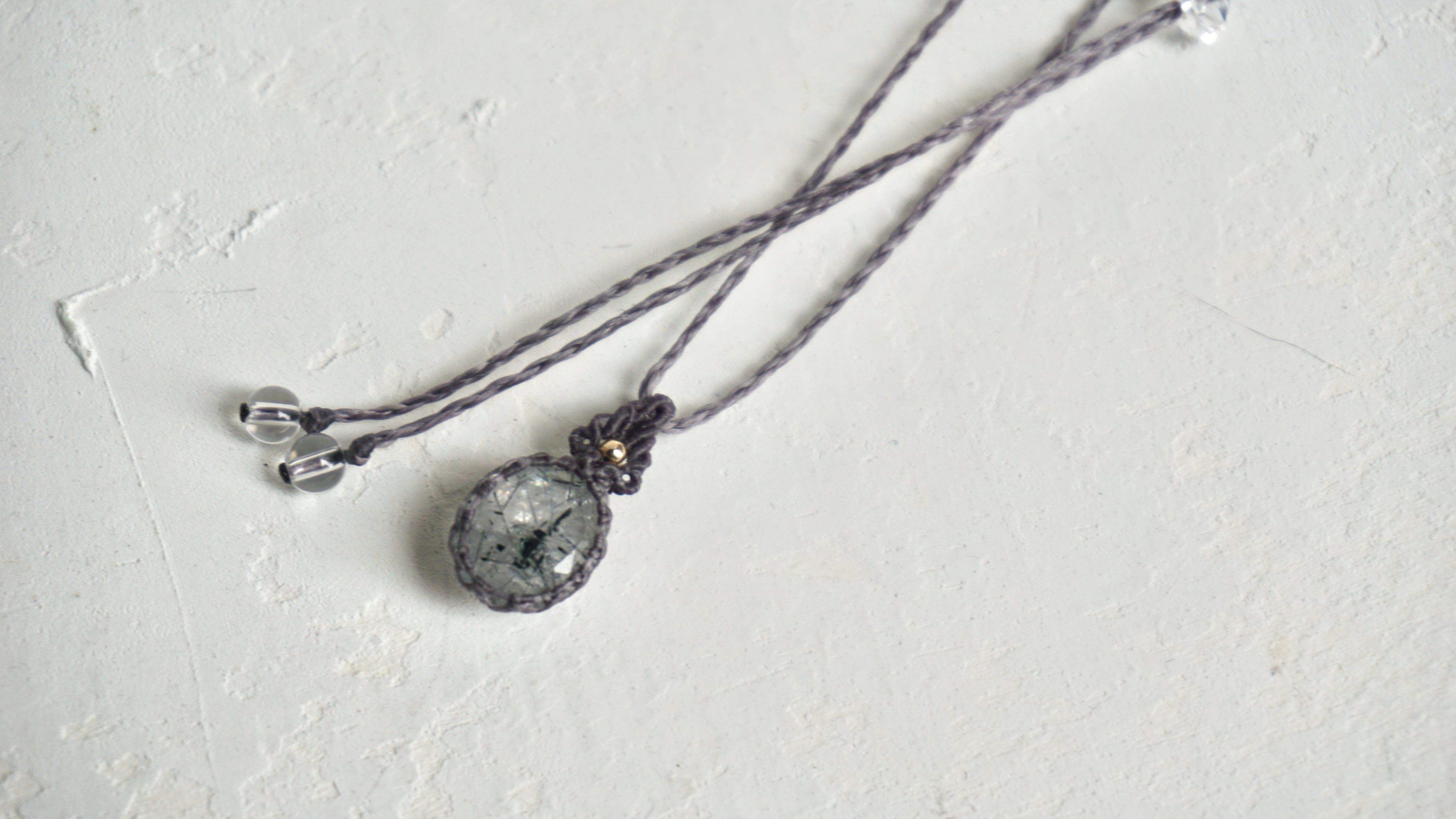 水晶の中に黒い線状のトルマリンが内包された石をネックレスに仕立てました。透明と黒が織りなす世界観に、カットされた水晶の表面と中のインクルージョンが光を反射し胸元のワンポイントとして洗練された雰囲気を演出するような仕上がりになりました。
