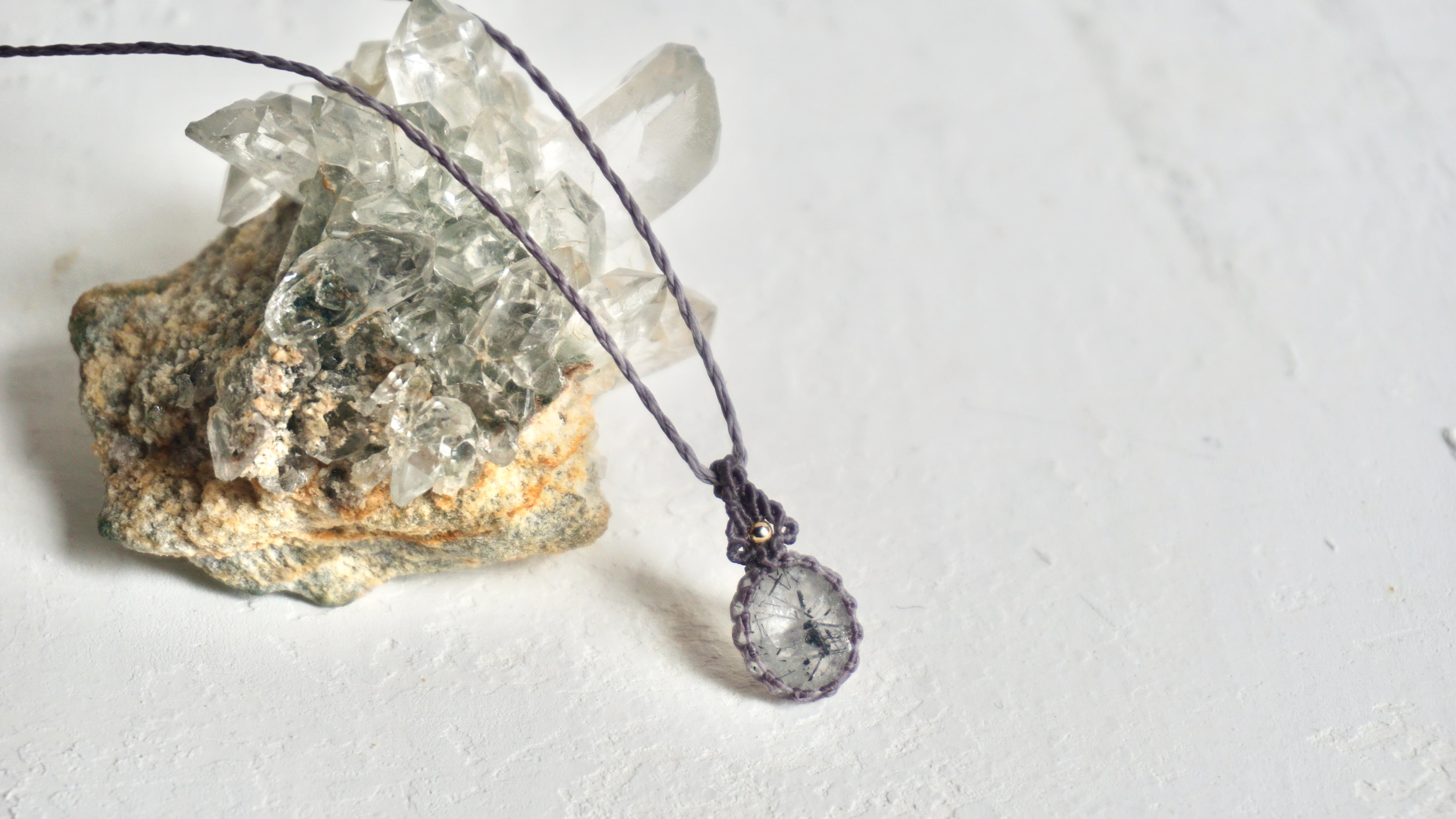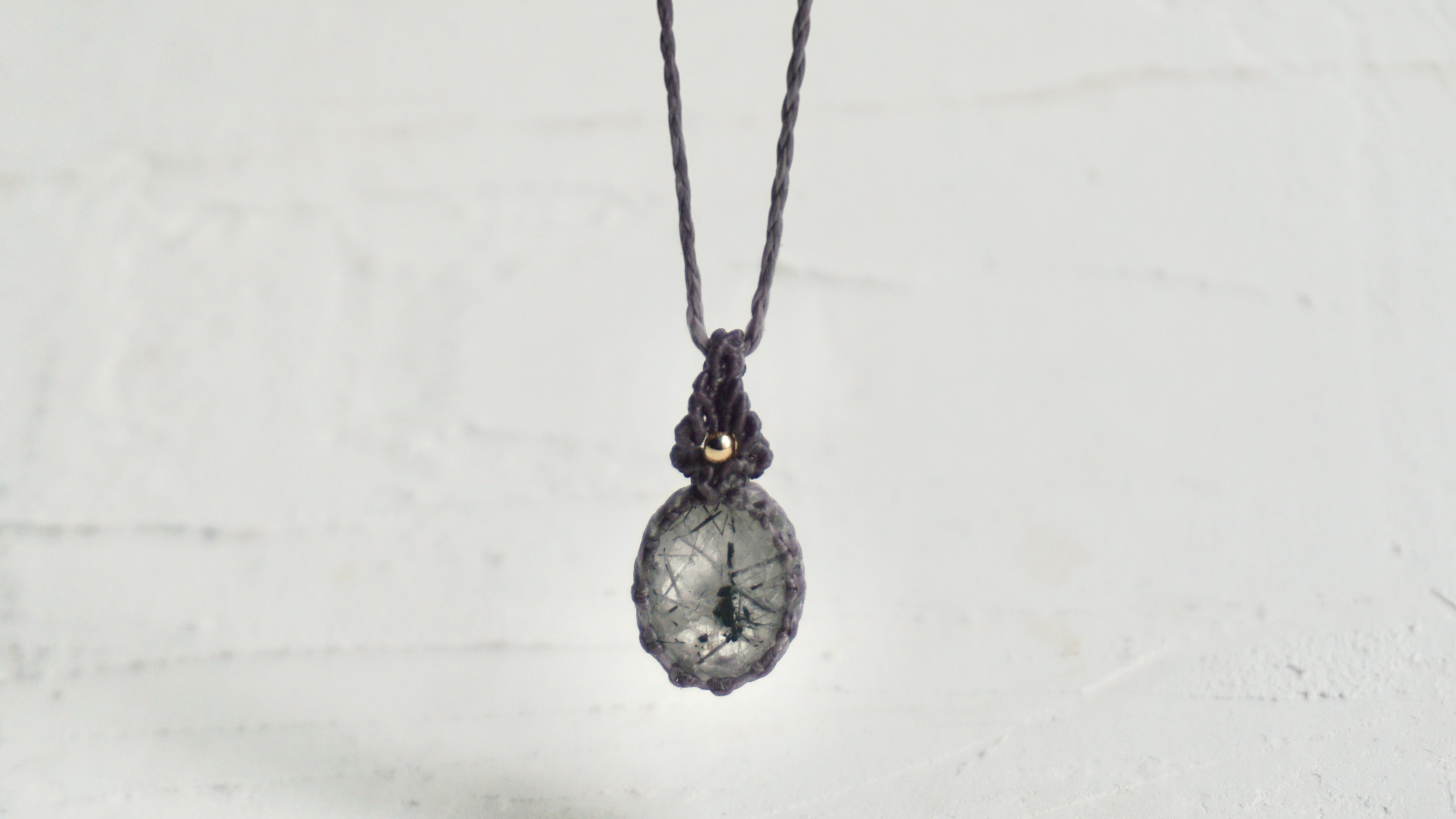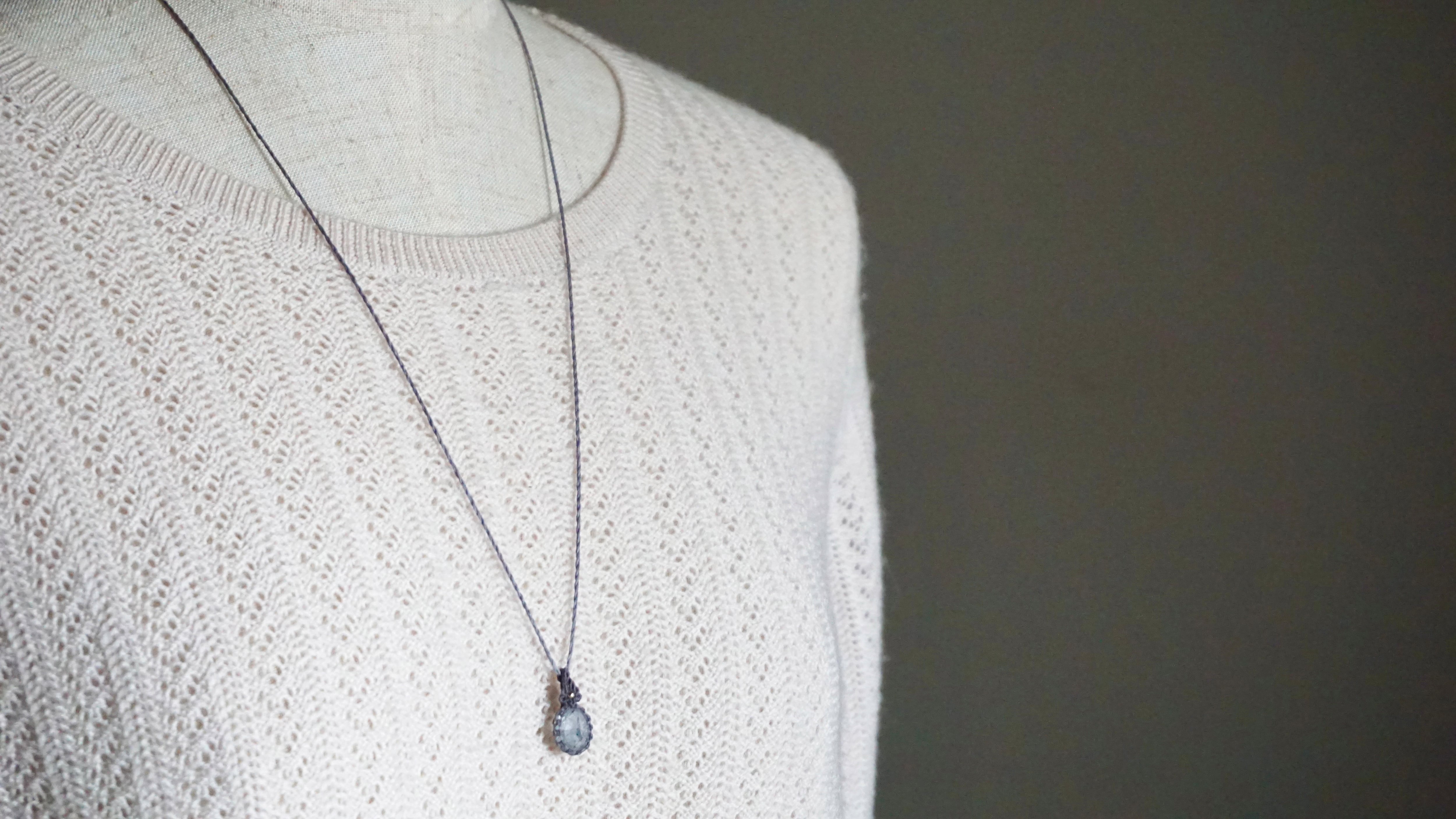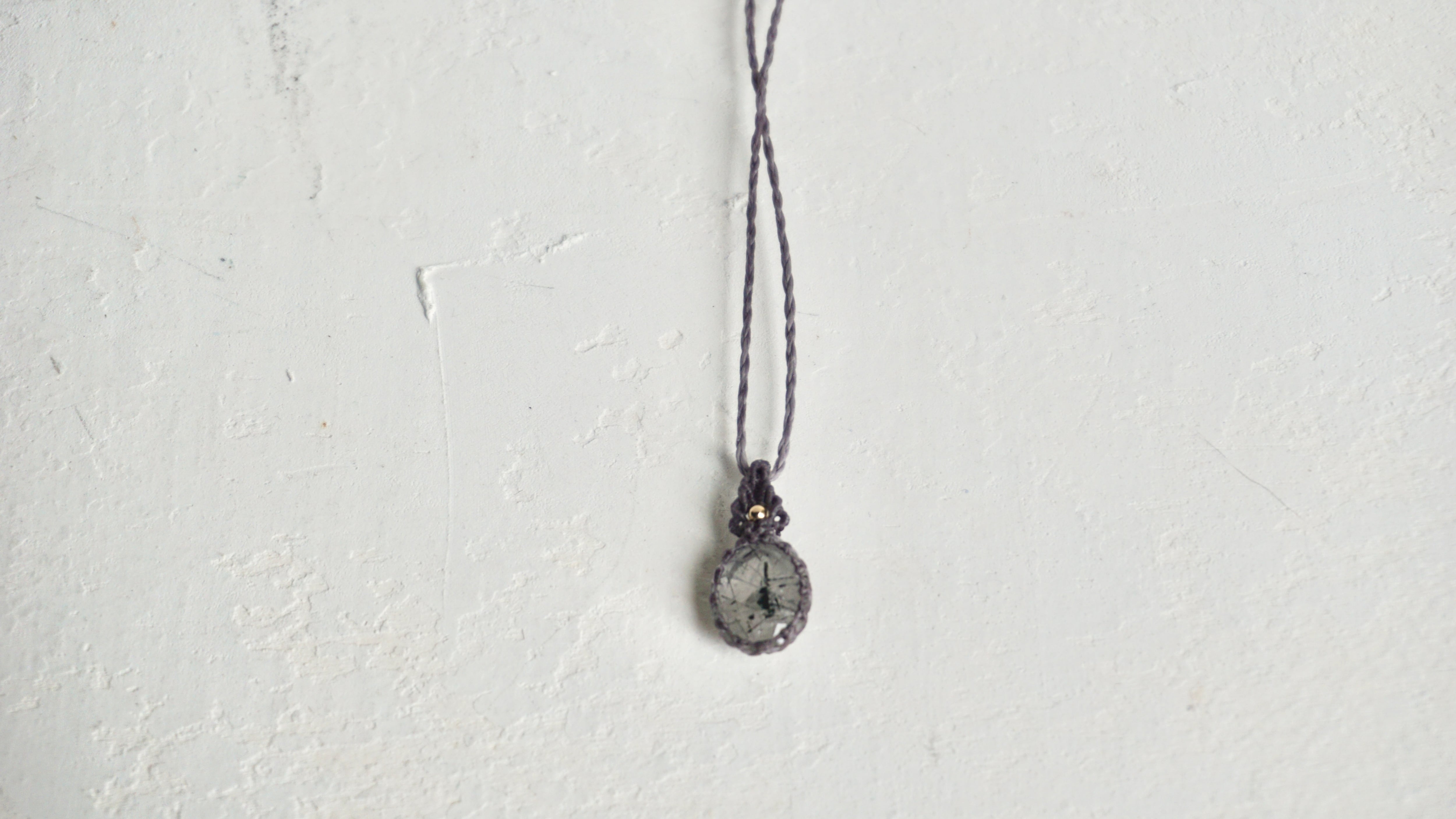 水晶の中に黒い線状のトルマリンが内包された石をネックレスに仕立てました。透明と黒が織りなす世界観に、カットされた水晶の表面と中のインクルージョンが光を反射し胸元のワンポイントとして洗練された雰囲気を演出するような仕上がりになりました。