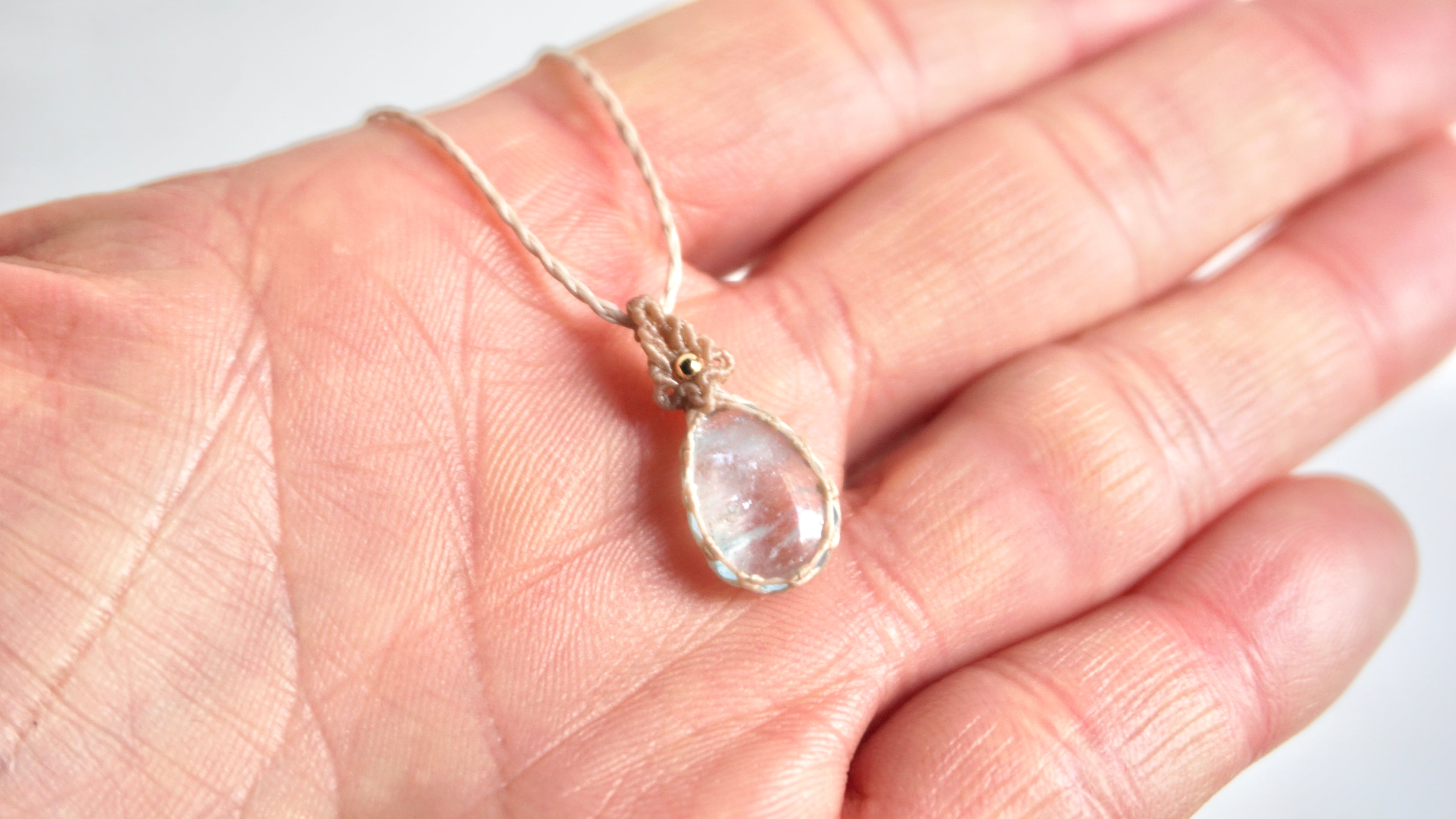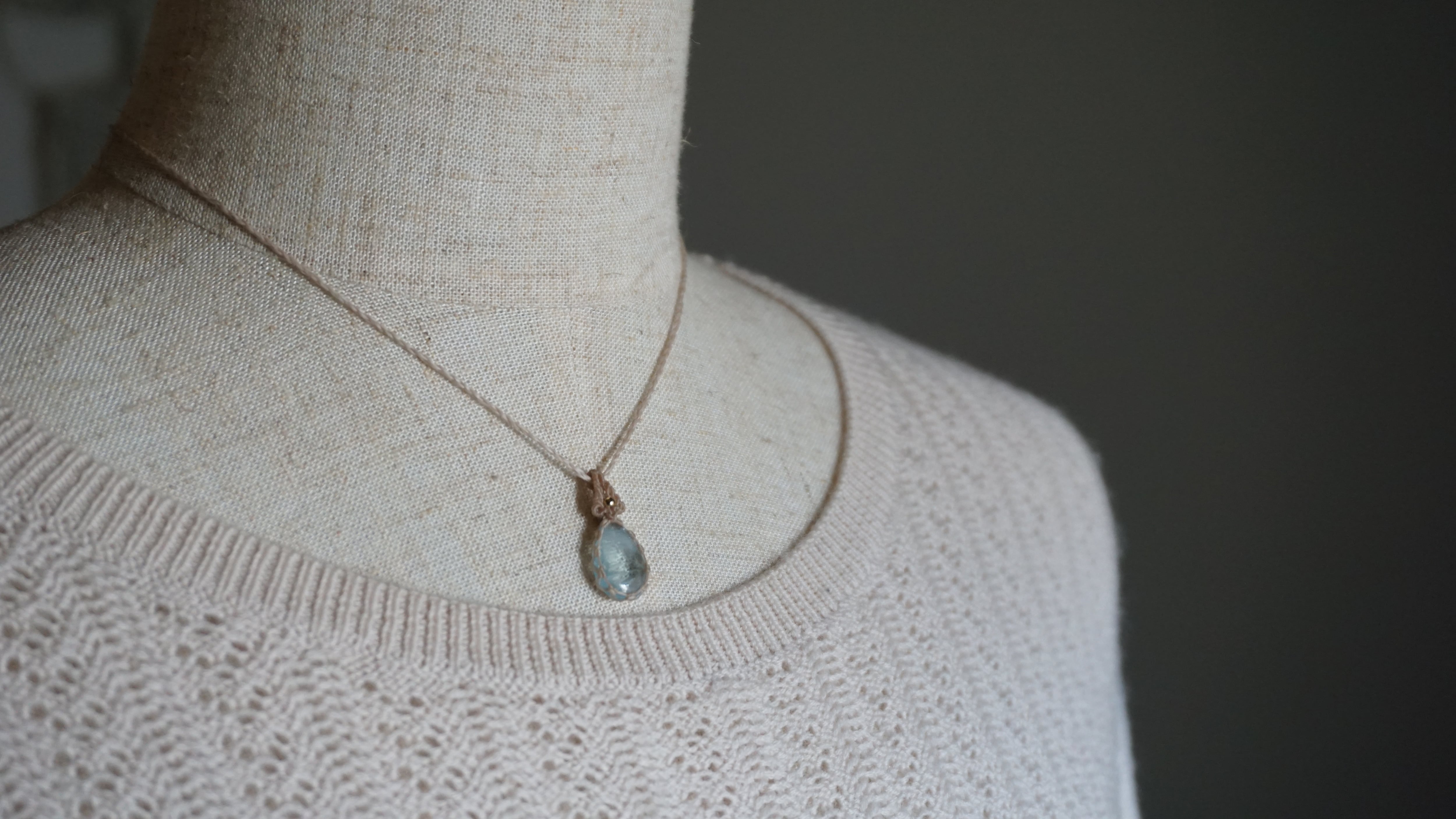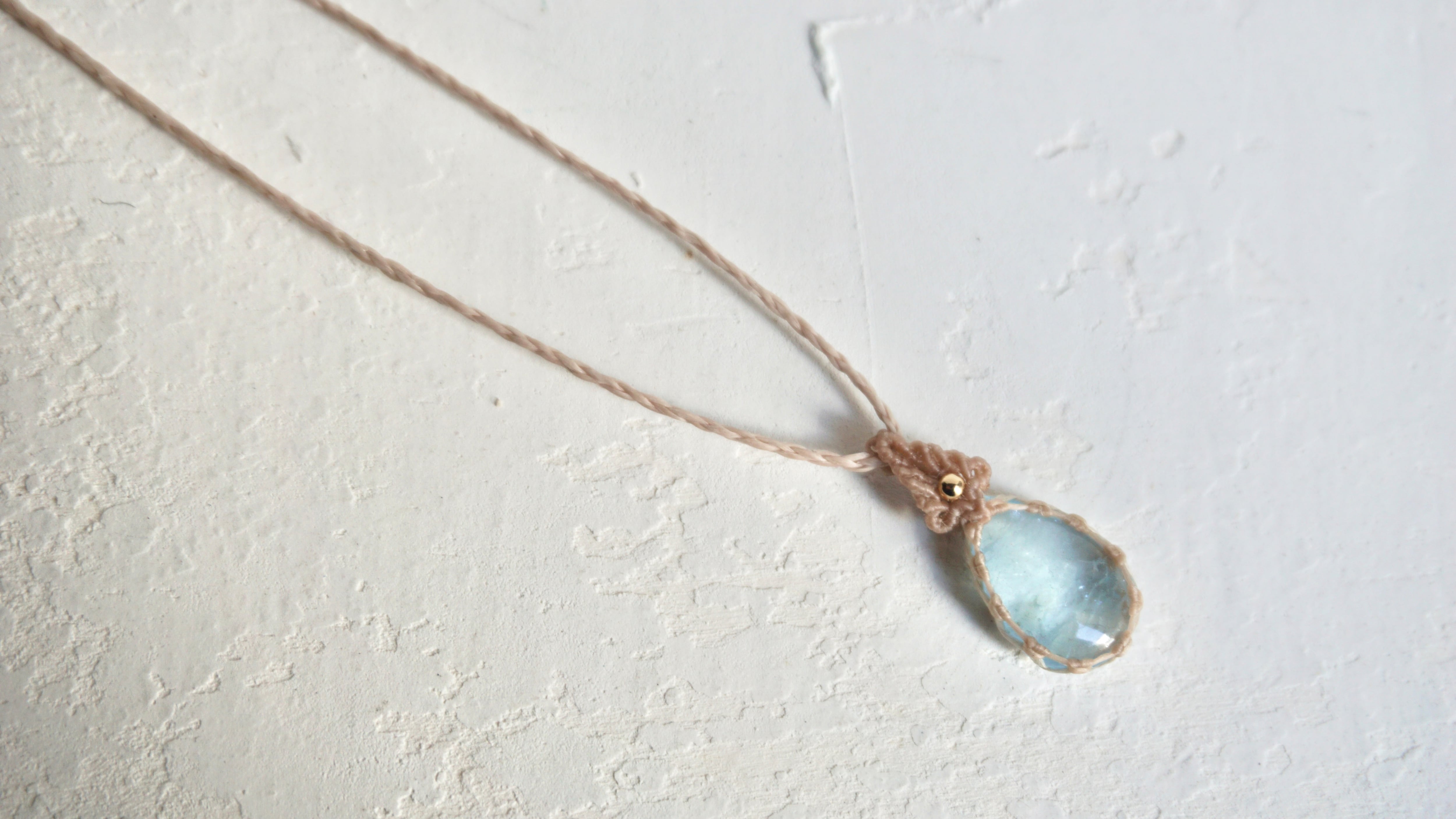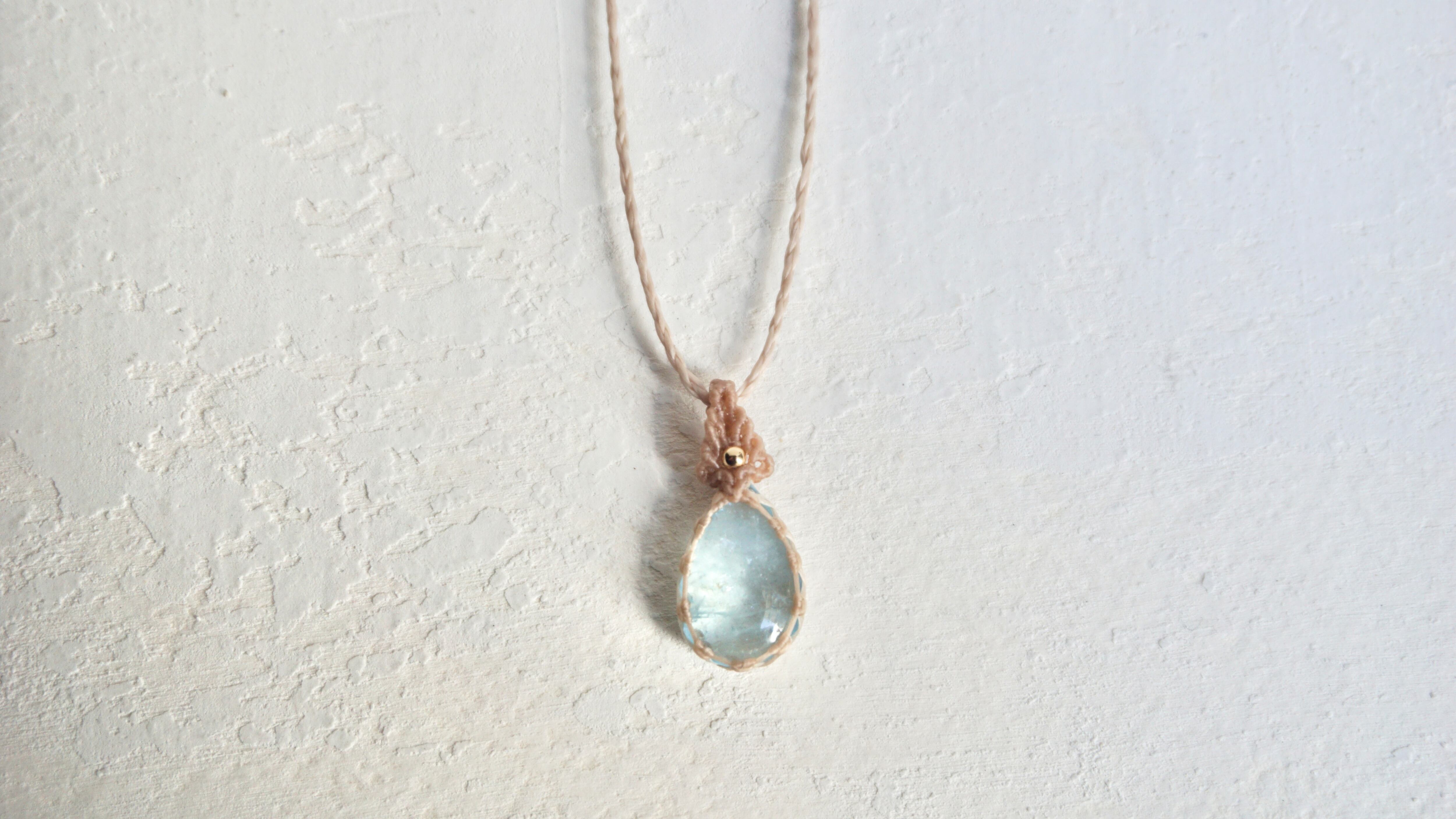 小さい粒でも色合い良く美しいアクアマリンをネックレスに仕立てました。石と編みの美しさのバランスがさらりとも美しい仕上がりとなりました。