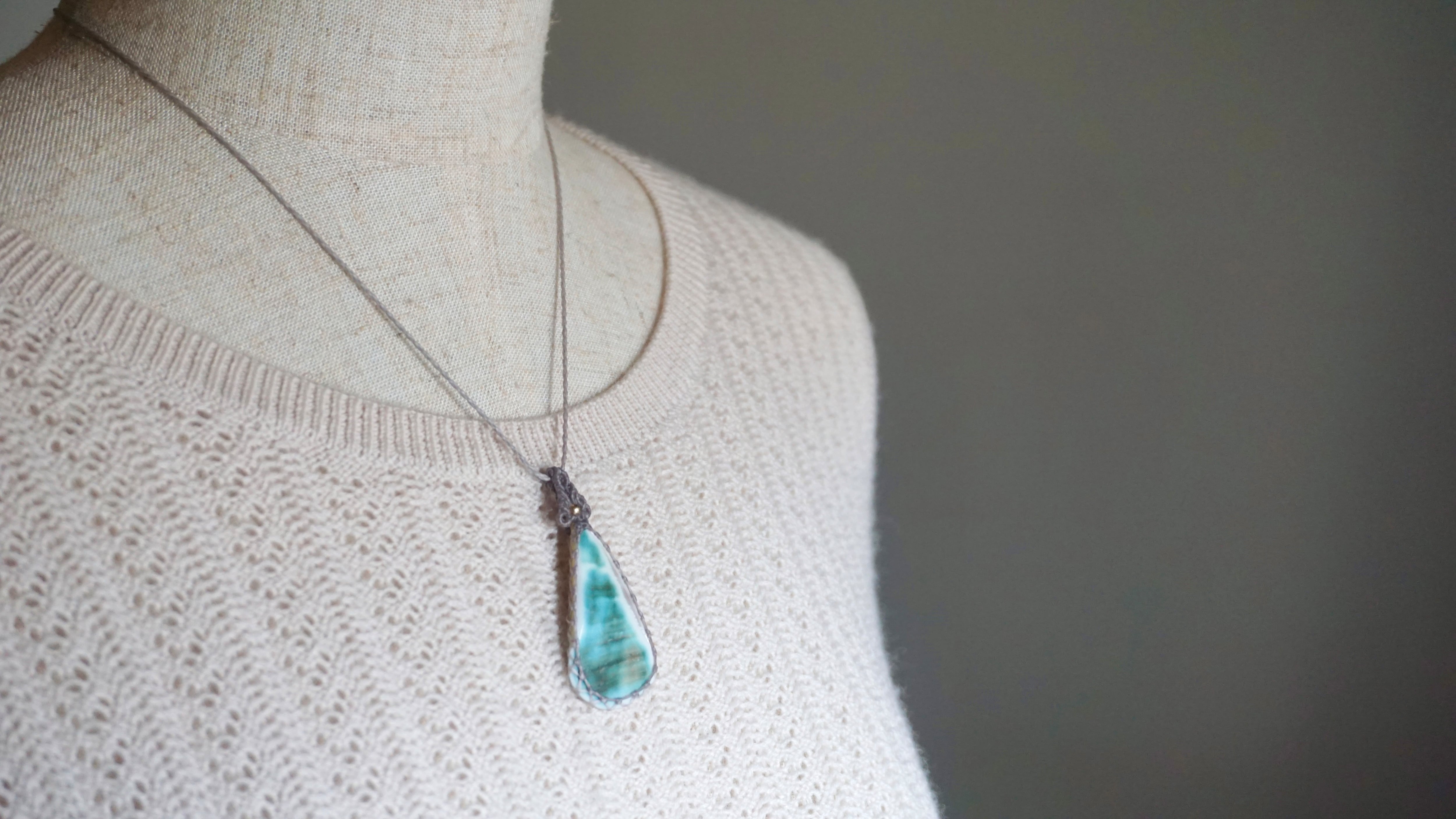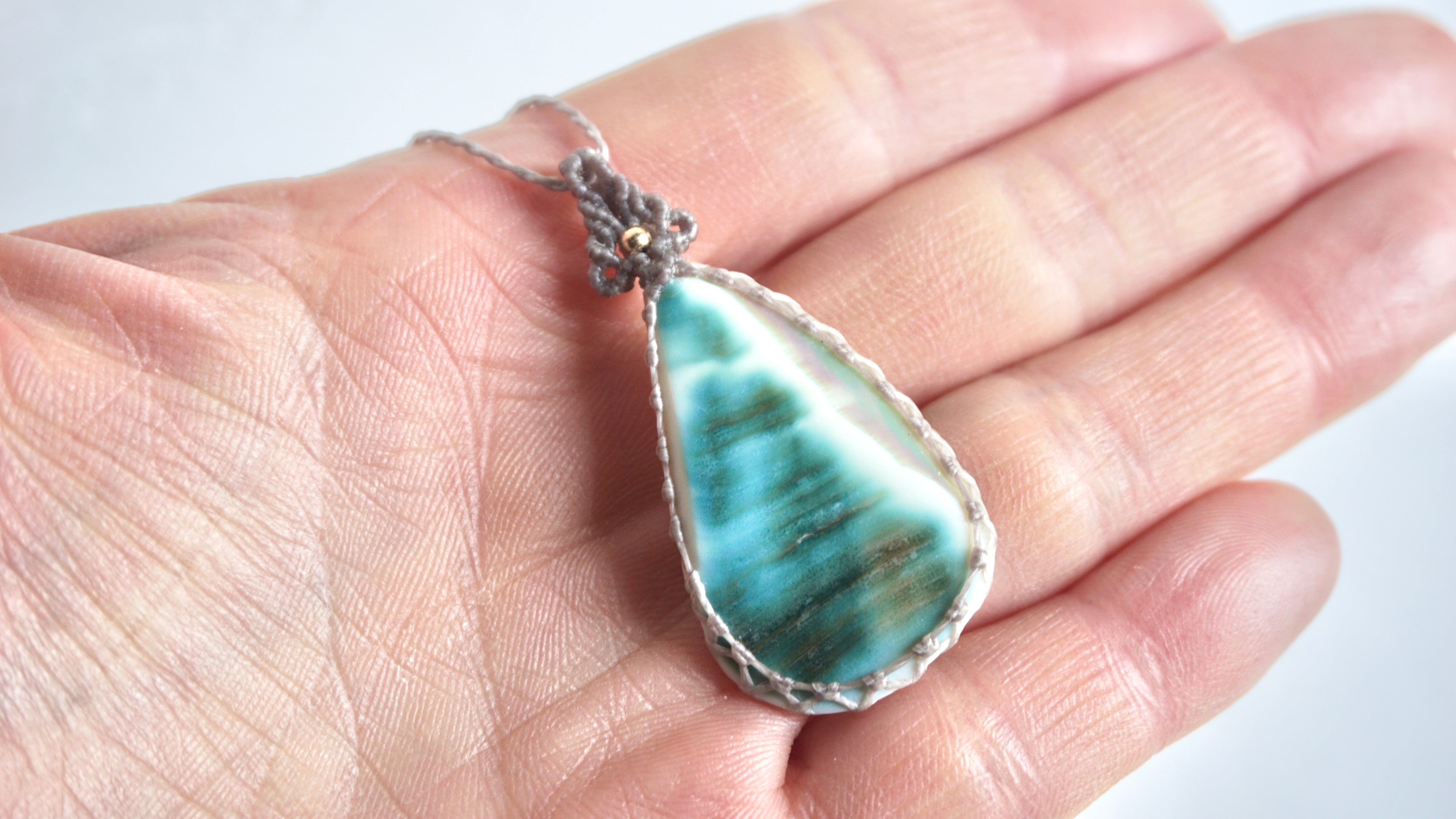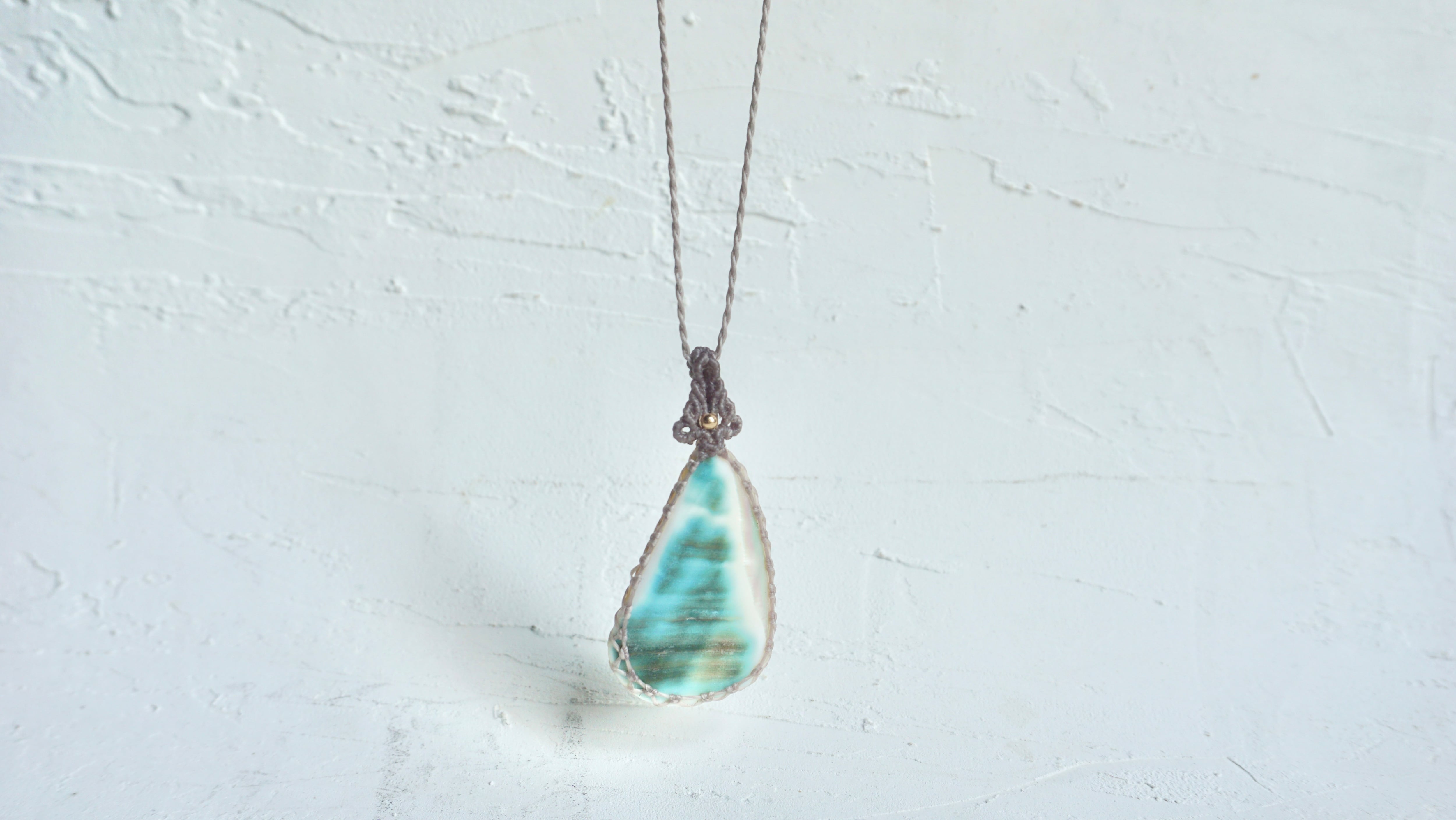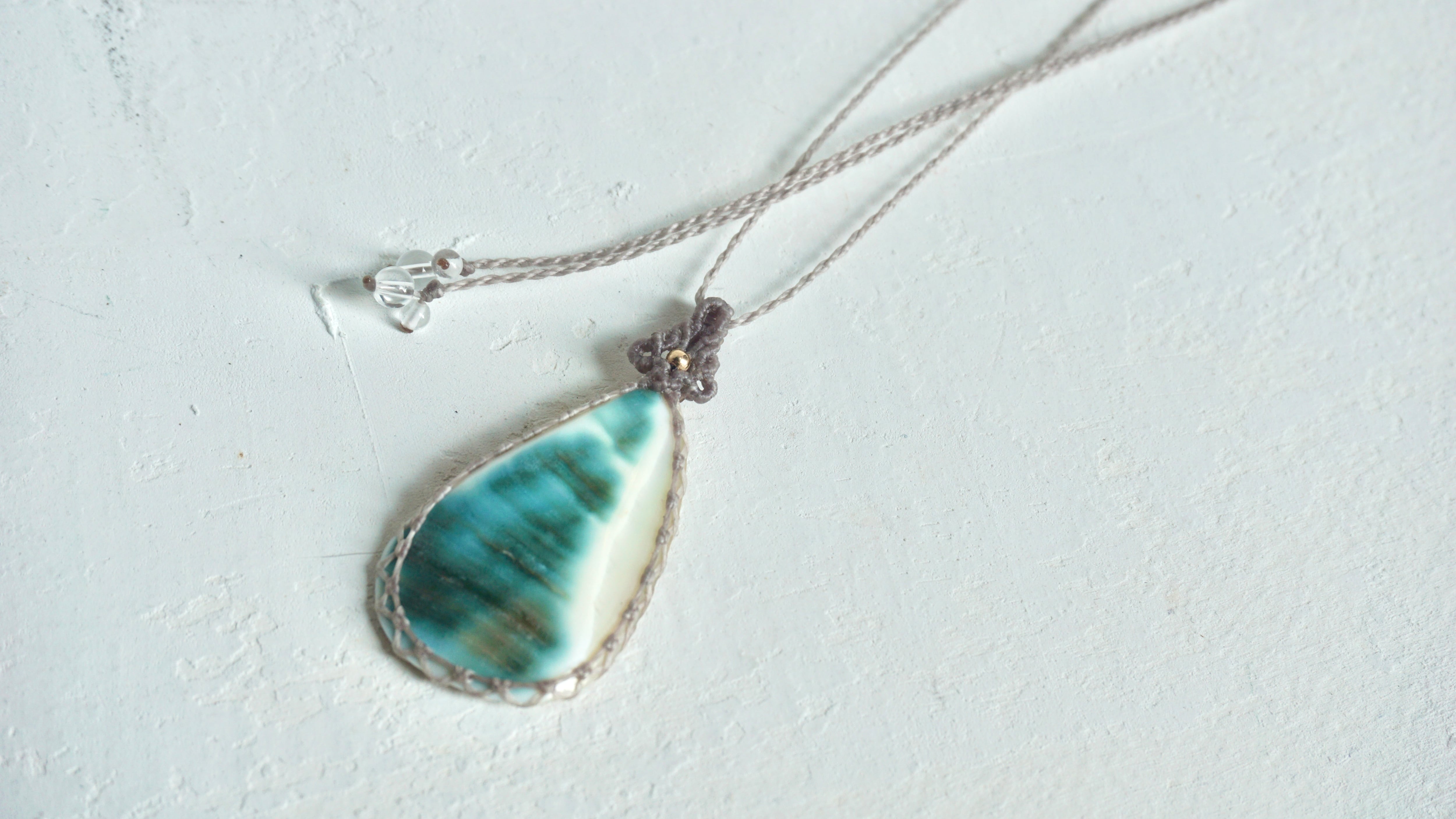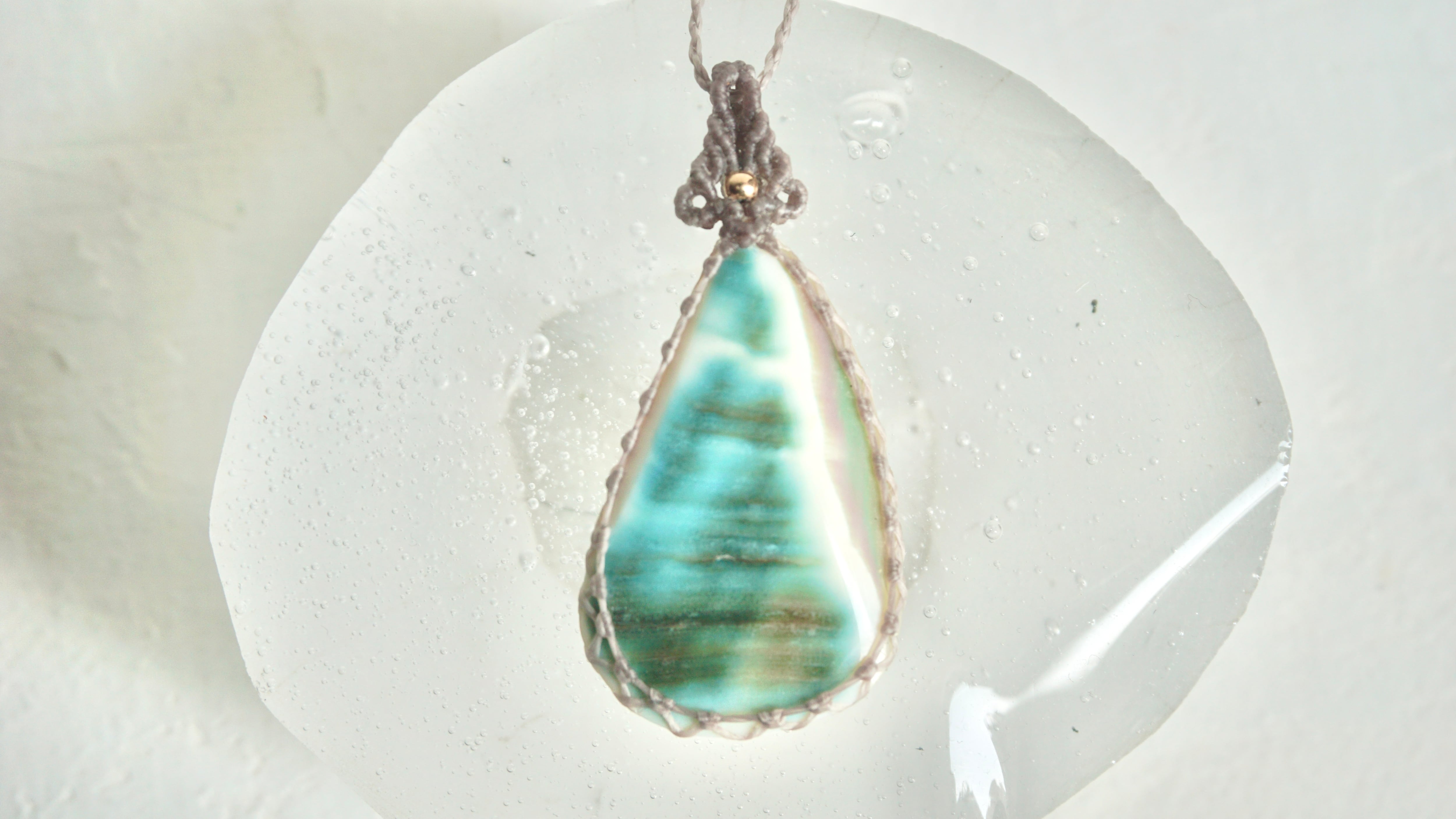 磨くと美しい青緑と真珠層の現れた夜光貝をその素材を活かしネックレスに仕立てました。