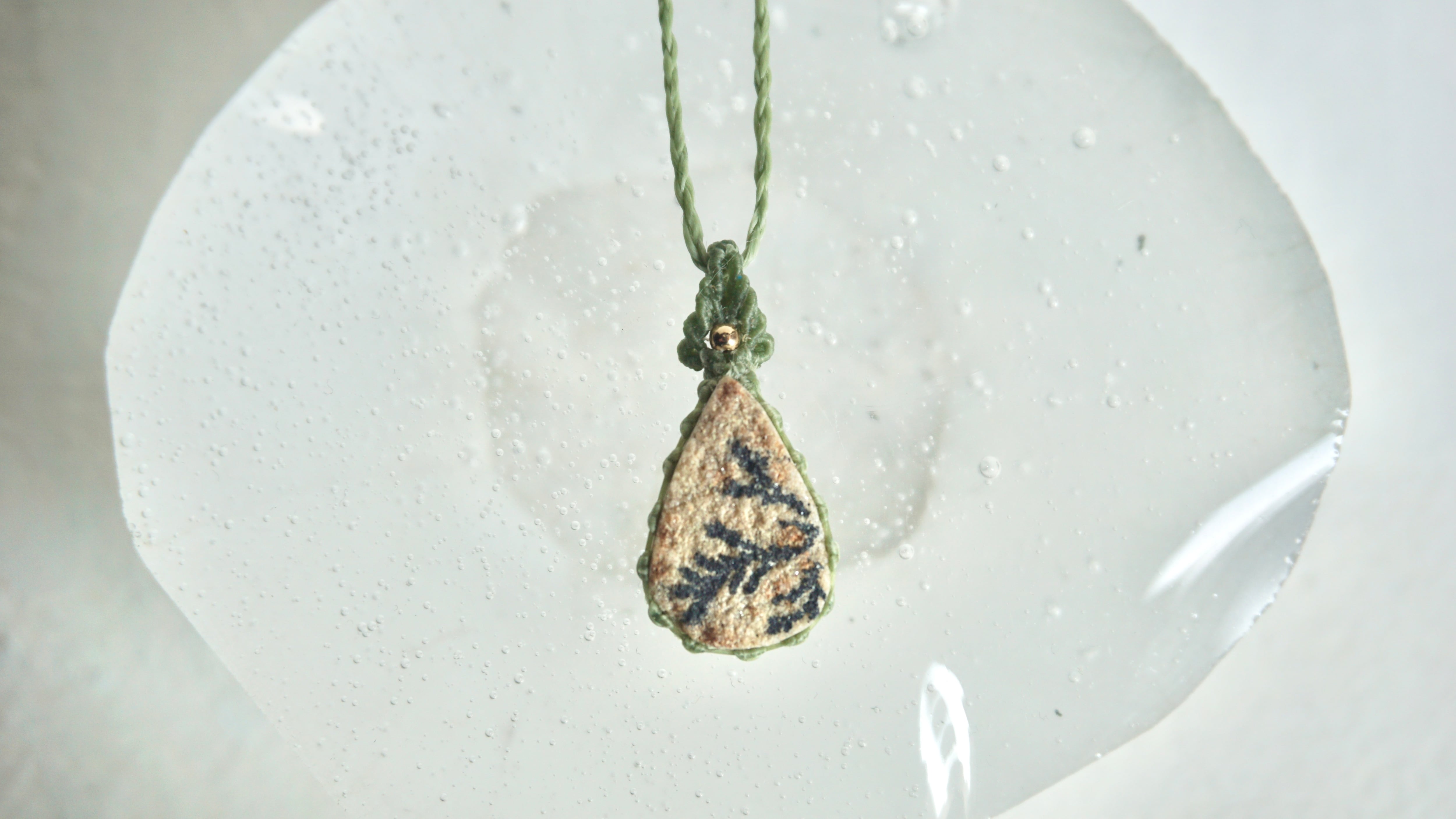 小粒ながらマットな表面が石を感じさせ、その上に伸びる植物のような表情がなんとも言えない石を仕立てました。